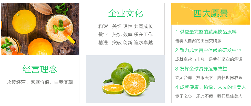在公司發(fā)展壯大的13年里,我們始終為客戶提供好的產(chǎn)品和技術(shù)支持、健全的售后服務,不斷引進國外的先進技術(shù)和科學管理模式,逐步健全了與產(chǎn)品發(fā)展相適應的具有農(nóng)產(chǎn)品加工特點的質(zhì)量管理體系,全體職員本著“和諧、敬業(yè)、精進”的理念,竭誠為國內(nèi)外的顧客提供最優(yōu)質(zhì)的服務。我公司采用國內(nèi)、外先進生產(chǎn)設備,年生產(chǎn)能力20000噸以上,主要產(chǎn)品包括:橙濃縮汁、蜜橘濃縮汁、柑橘原汁、檸檬原汁、血橙濃縮汁、芒果漿、橙果粒罐頭、橙瓣罐頭、白柚果粒罐頭、仙草凍罐頭、檸檬切片罐頭、速凍橙蓉、速凍檸檬蓉、速凍橙皮(丁、絲)、速凍檸檬皮(丁、絲)、蜜漬橙皮檸檬片、柚子等。南充佳美產(chǎn)品行銷覆蓋全國及遠銷海內(nèi)外,是國內(nèi)濃縮汁、原汁、及速凍產(chǎn)品行業(yè)規(guī)格最大、最具競爭力的企業(yè)之一,期待與您的合作。